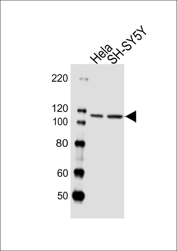 Western blot analysis of lysates from Hela,SH-SY5Y cell line (from left to right), using Ror2 Antibody (C-term)(Cat. APR17833G). APR17833G was diluted at 1:1000 at each lane. A goat anti-rabbit IgG H&L(HRP) at 1:10000 dilution was used as the secondary antibody.Lysates at 20ug per lane.
