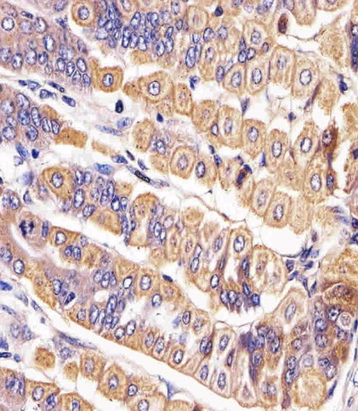 Immunohistochemical analysis of paraffin-embedded M. stomach section using Mouse Ror2 Antibody (C-term)( APR17833G). APR17833G was diluted at 1:25 dilution. A undiluted biotinylated goat polyvalent antibody was used as the secondary, followed by DAB staining. |