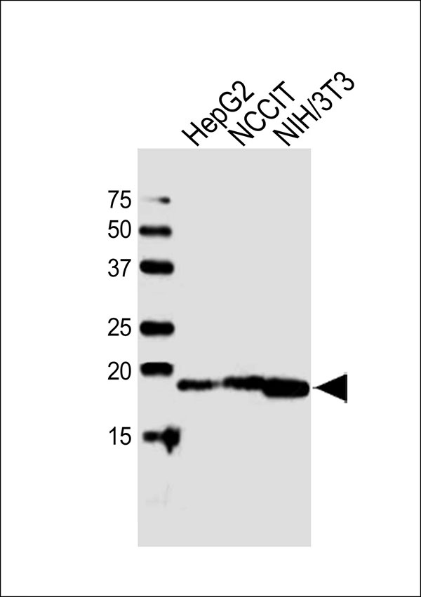 Western blot analysis of lysates from HepG2,NCCIT,mouse NIH/3T3 cell line (from left to right), using HMGA2 Antibody (N-term)(Cat. APR17783G). APR17783G was diluted at 1:1000 at each lane. A goat anti-rabbit IgG H&L(HRP) at 1:10000 dilution was used as the secondary antibody.Lysates at 20ug per lane. |