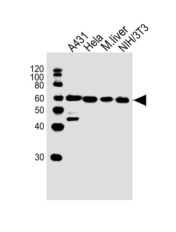 All lanes : Anti-HDAC2 Antibody (C-term) at 1:1000 dilution Lane 1: A431 whole cell lysates Lane 2: Hela whole cell lysates Lane 3: mouse liver lysates Lane 4: NIH/3T3 whole cell lysates Lysates/proteins at 20 μg per lane. Secondary Goat Anti-Rabbit IgG, (H+L),Peroxidase conjugated at 1/10000 dilution Predicted band size : 55 kDa Blocking/Dilution buffer: 5% NFDM/TBST.