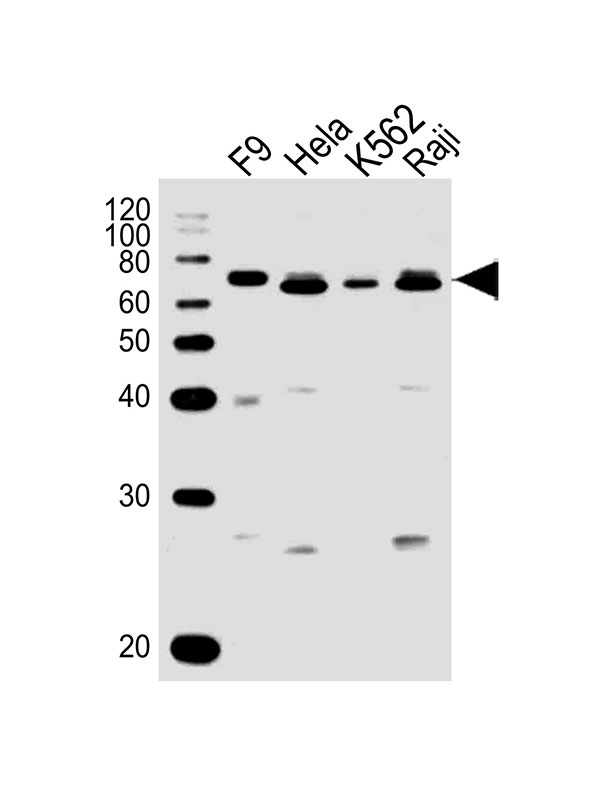 All lanes : Anti-GNL3 Antibody (N-term) at 1:1000 dilution Lane 1: F9 whole cell lysates Lane 2: Hela whole cell lysates Lane 3: K562 whole cell lysates Lane 4: Raji whole cell lysates Lysates/proteins at 20 μg per lane. Secondary Goat Anti-Rabbit IgG, (H+L),Peroxidase conjugated at 1/10000 dilution Predicted band size : 62 kDa Blocking/Dilution buffer: 5% NFDM/TBST.