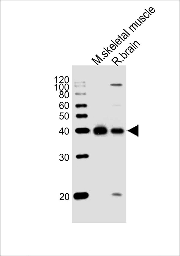 All lanes : Anti-Dbx1 Antibody (C-term) at 1:1000 dilution Lane 1: mouse skeletal muscle lysates Lane 2: rat brain lysates Lysates/proteins at 20 μg per lane. Secondary Goat Anti-Rabbit IgG, (H+L),Peroxidase conjugated at 1/10000 dilution Predicted band size : 36 kDa Blocking/Dilution buffer: 5% NFDM/TBST. |