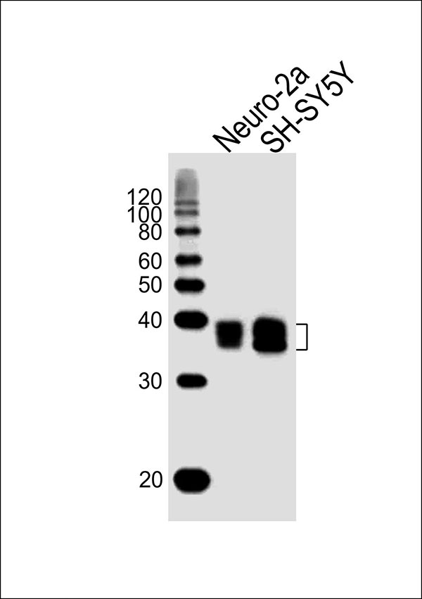 All lanes : Anti-Msi1 Antibody (Center) at 1:1000 dilution Lane 1: Neuro-2a whole cell lysates Lane 2: SH-SY5Y whole cell lysates Lysates/proteins at 20 μg per lane. Secondary Goat Anti-Rabbit IgG, (H+L),Peroxidase conjugated at 1/10000 dilution Predicted band size : 39 kDa Blocking/Dilution buffer: 5% NFDM/TBST. |