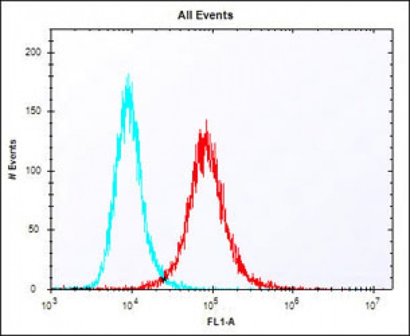 Overlay histogram showing NIH/3T3 cells stained with APR17828G (red line). The cells were fixed with 2% paraformaldehyde (10 min) and then permeabilized with 90% methanol for 10 min. The cells were then icubated in 2% bovine serum albumin to block non-specific protein-protein interactions followed by the antibody (APR17828G, 1:25 dilution) for 60 min at 37?C. The secondary antibody used was Alexa Fluor? 488 goat anti-rabbit lgG (H+L) (1583138) at 1/400 dilution for 40 min at 37?C. Isotype control antibody (blue line) was rabbit IgG1 (1μg/1x10^6 cells) used under the same conditions. Acquisition of >10, 000 events was performed.