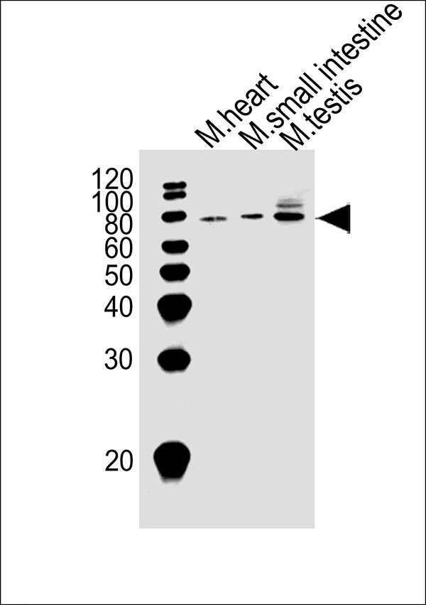All lanes : Anti-Klf4 Antibody (Center) at 1:1000 dilution Lane 1: mouse heart lysates Lane 2: mouse small intestine lysates Lane 3: mouse testis lysates Lysates/proteins at 20 μg per lane. Secondary Goat Anti-Rabbit IgG, (H+L),Peroxidase conjugated at 1/10000 dilution Predicted band size : 52 kDa Blocking/Dilution buffer: 5% NFDM/TBST. |