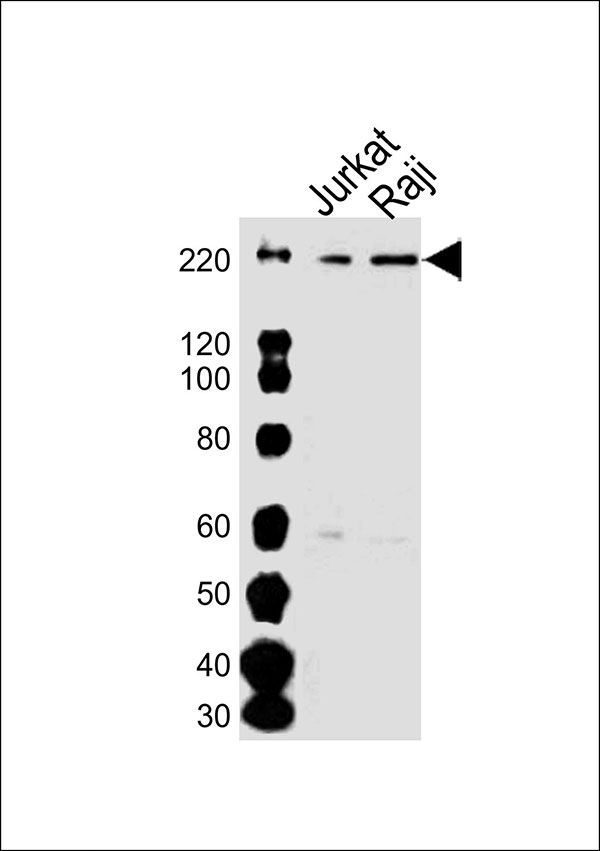 All lanes : Anti-DOCK2 Antibody (C-term) at 1:1000 dilution Lane 1: Jurkat whole cell lysates Lane 2: Raji whole cell lysates Lysates/proteins at 20 μg per lane. Secondary Goat Anti-Rabbit IgG, (H+L),Peroxidase conjugated at 1/10000 dilution Predicted band size : 212 kDa Blocking/Dilution buffer: 5% NFDM/TBST. |