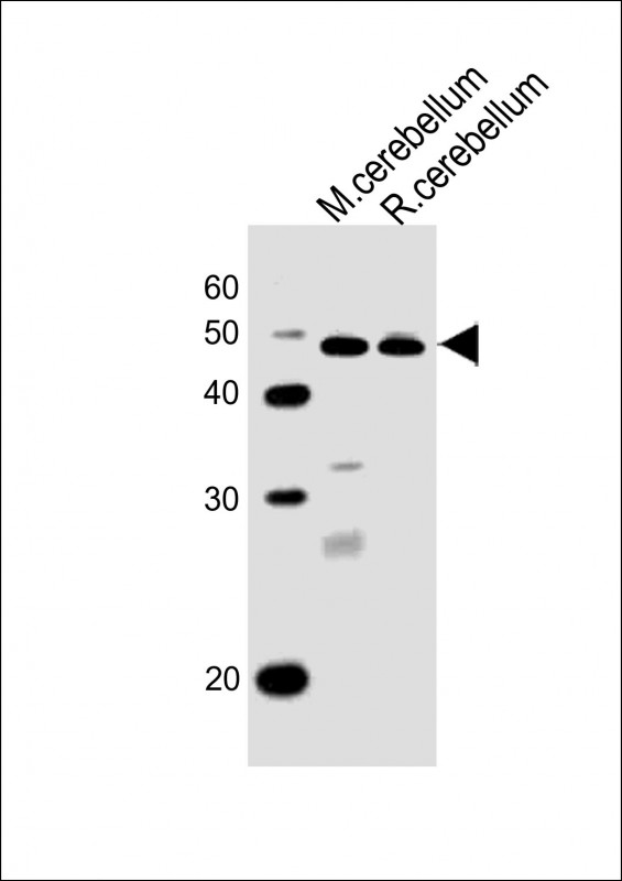 All lanes : Anti-Pax6 Antibody (C-term) at 1:1000 dilution Lane 1: mouse cerebellum lysates Lane 2: rat cerebellum lysates Lysates/proteins at 20 μg per lane. Secondary Goat Anti-Rabbit IgG, (H+L), Peroxidase conjugated at 1/10000 dilution Predicted band size : 47 kDa Blocking/Dilution buffer: 5% NFDM/TBST. |