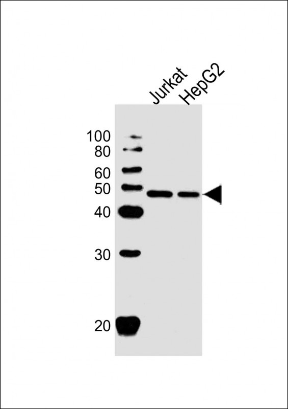 All lanes : Anti-FDFT1 Antibody (C-term) at 1:1000 dilution Lane 1: Jurkat whole cell lysate Lane 2: HepG2 whole cell lysate Lysates/proteins at 20 μg per lane. Secondary Goat Anti-Rabbit IgG, (H+L), Peroxidase conjugated at 1/10000 dilution. Predicted band size : 48 kDa Blocking/Dilution buffer: 5% NFDM/TBST. |