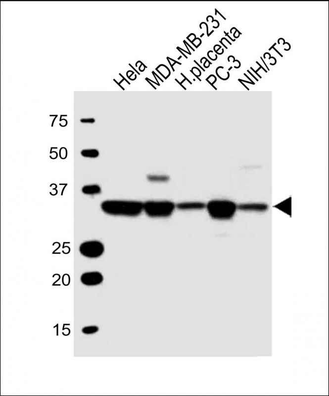All lanes : Anti-LDHA Antibody (C-term) at 1:1000 dilution Lane 1: Hela whole cell lysate Lane 2: MDA-MB-231 whole cell lysate Lane 3: human placenta lysate Lane 4: PC-3 whole cell lysate Lane 5: NIH/3T3 whole cell lysate Lysates/proteins at 20 μg per lane. Secondary Goat Anti-Rabbit IgG, (H+L), Peroxidase conjugated at 1/10000 dilution. Predicted band size : 36 kDa. Blocking/Dilution buffer: 5% NFDM/TBST.