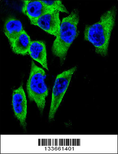 Confocal immunofluorescent analysis of LDHA Antibody (C-term)( APR08176G) with A375 cell followed by Alexa Fluor 488-conjugated goat anti-rabbit lgG (green).DAPI was used to stain the cell nuclear (blue).