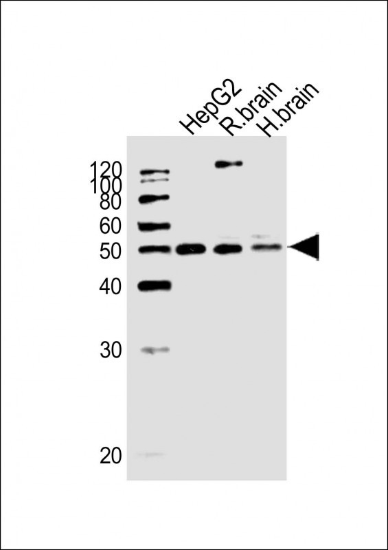 All lanes : Anti-HTR1B Antibody at 1:1000 dilution Lane 1: HepG2 whole cell lysate Lane 2: rat brain lysate Lane 3: human brain lysate Lysates/proteins at 20 μg per lane. Secondary Goat Anti-Rabbit IgG, (H+L), Peroxidase conjugated at 1/10000 dilution. Predicted band size : 43 kDa Blocking/Dilution buffer: 5% NFDM/TBST. |