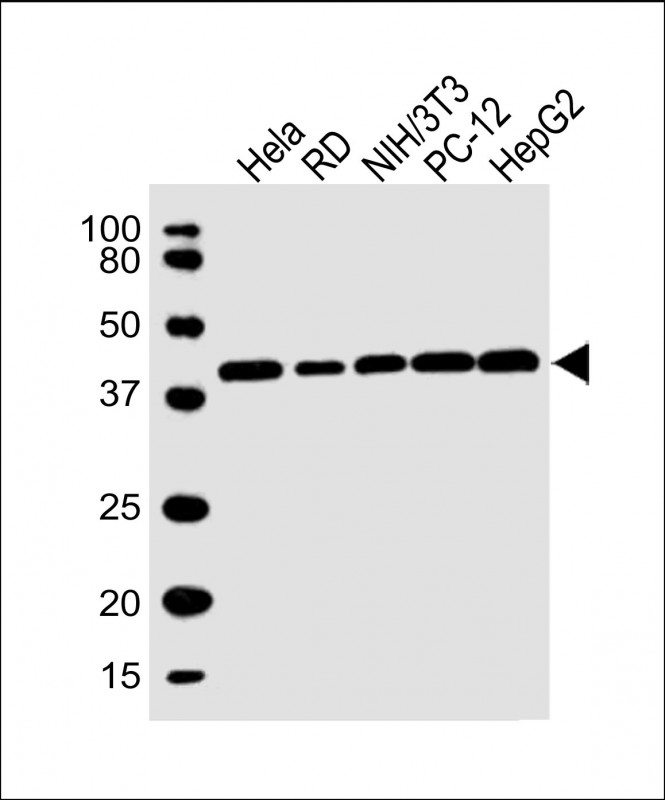 All lanes : Anti-PDHA1 Antibody at 1:1000 dilution Lane 1: Hela whole cell lysate Lane 2: RD whole cell lysate Lane 3: NIH/3T3 whole cell lysate Lane 4: PC-12 whole cell lysate Lane 5: HepG2 whole cell lysate Lysates/proteins at 20 μg per lane. Secondary Goat Anti-Rabbit IgG, (H+L), Peroxidase conjugated at 1/10000 dilution. Predicted band size : 43 kDa Blocking/Dilution buffer: 5% NFDM/TBST. |