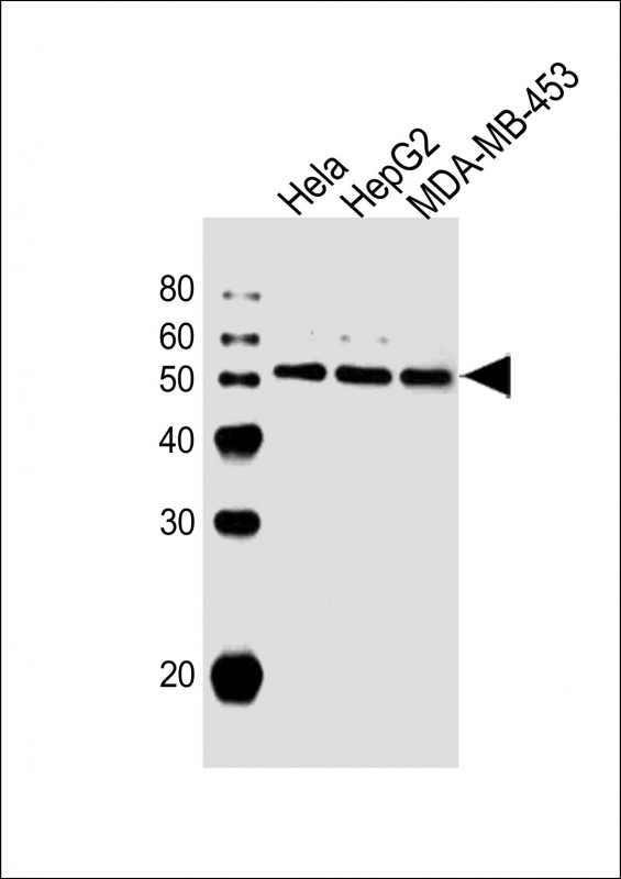 All lanes : Anti-TERF2IP Antibody (C-term) at 1:1000 dilution Lane 1: Hela whole cell lysate Lane 2: HepG2 whole cell lysate Lane 3: MDA-MB-453 whole cell lysate Lysates/proteins at 20 μg per lane. Secondary Goat Anti-Rabbit IgG, (H+L), Peroxidase conjugated at 1/10000 dilution. Predicted band size : 44 kDa Blocking/Dilution buffer: 5% NFDM/TBST.