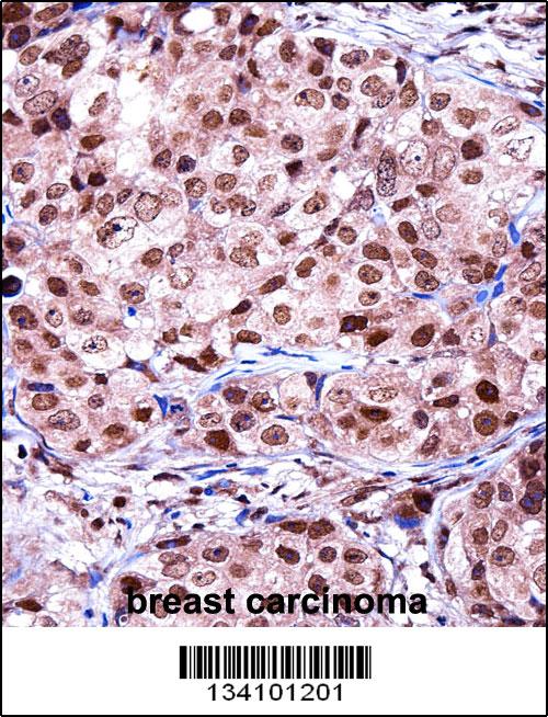 TERF2IP Antibody (C-term) (AMM08163G)immunohistochemistry analysis in formalin fixed and paraffin embedded human breast carcinoma followed by peroxidase conjugation of the secondary antibody and DAB staining.This data demonstrates the use of TERF2IP Antibody (C-term) for immunohistochemistry. Clinical relevance has not been evaluated. |