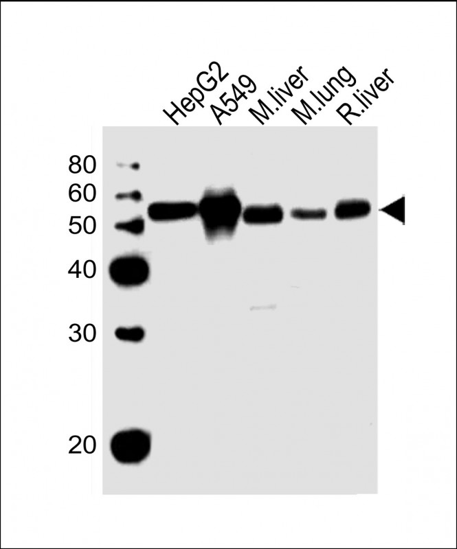 All lanes : Anti-ALDH2 Antibody (N-term) at 1:1000 dilution Lane 1: HepG2 whole cell lysate Lane 2: A549 whole cell lysate Lane 3: mouse liver lysate Lane 4: mouse lung lysate Lane 5: rat liver lysate Lysates/proteins at 20 μg per lane. Secondary Goat Anti-Rabbit IgG, (H+L), Peroxidase conjugated at 1/10000 dilution. Predicted band size : 56 kDa Blocking/Dilution buffer: 5% NFDM/TBST. |