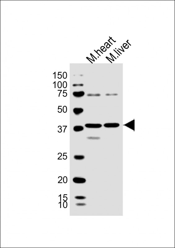 All lanes : Anti-P2ry4 Antibody (N-term) at 1:2000 dilution Lane 1: mouse heart lysate Lane 2: mouse liver lysate Lysates/proteins at 20 μg per lane. Secondary Goat Anti-Rabbit IgG, (H+L), Peroxidase conjugated at 1/10000 dilution. Predicted band size : 41 kDa Blocking/Dilution buffer: 5% NFDM/TBST. |