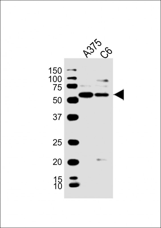 All lanes : Anti-SOX10 Antibody (Center) at 1:2000 dilution Lane 1: A375 whole cell lysate Lane 2: C6 whole cell lysate Lysates/proteins at 20 μg per lane. Secondary Goat Anti-Rabbit IgG, (H+L), Peroxidase conjugated at 1/10000 dilution. Predicted band size : 50 kDa Blocking/Dilution buffer: 5% NFDM/TBST. |