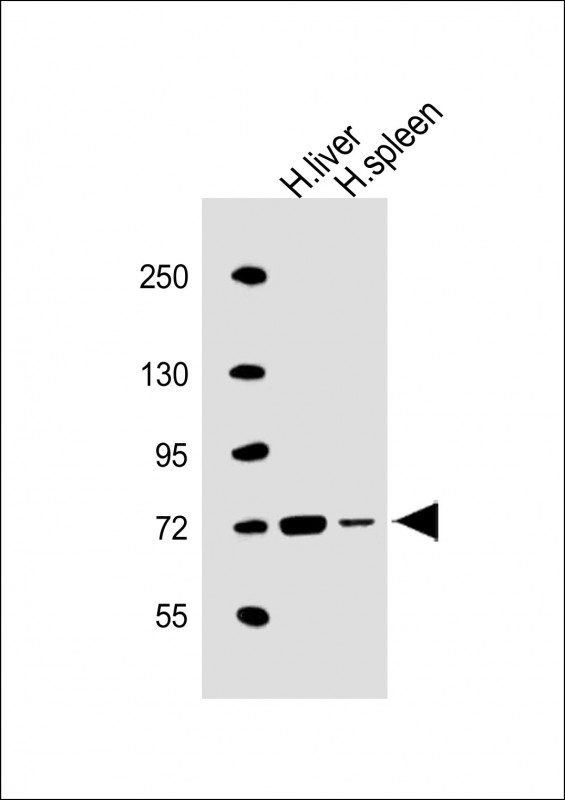 All lanes : Anti-SLC5A4 Antibody (C-term) at 1:1000 dilution Lane 1: human liver lysate Lane 2: human spleen lysate Lysates/proteins at 20 μg per lane. Secondary Goat Anti-Rabbit IgG, (H+L), Peroxidase conjugated at 1/10000 dilution. Predicted band size : 72 kDa Blocking/Dilution buffer: 5% NFDM/TBST. |