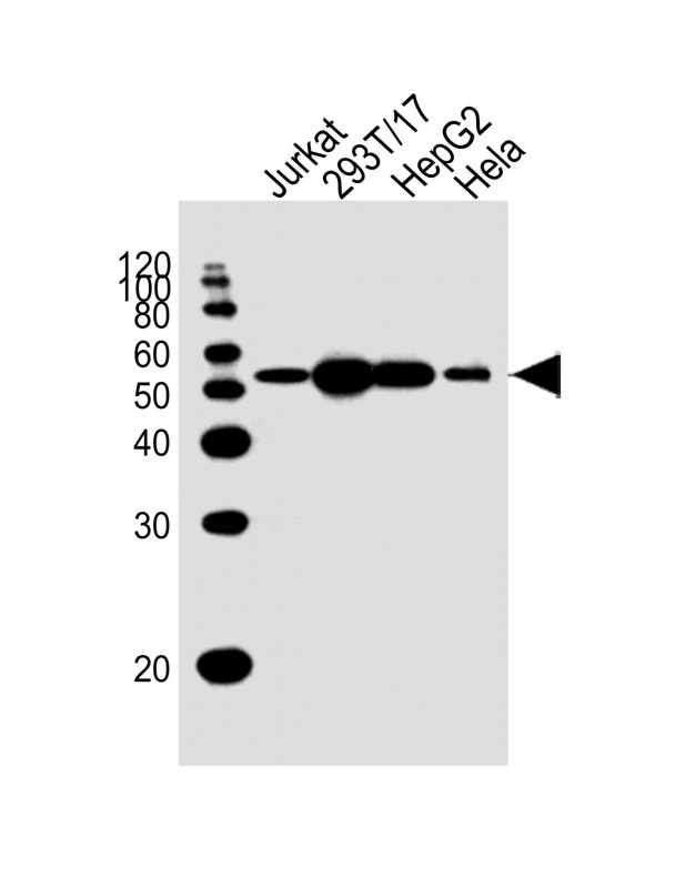 All lanes : Anti-TUBB2A Antibody (C-term) at 1:1000 dilution Lane 1: Jurkat whole cell lysate Lane 2: 293T/17 whole cell lysate Lane 3: HepG2 whole cell lysate Lane 4: Hela whole cell lysate Lysates/proteins at 20 μg per lane. Secondary Goat Anti-Rabbit IgG, (H+L), Peroxidase conjugated at 1/10000 dilution. Predicted band size : 50 kDa Blocking/Dilution buffer: 5% NFDM/TBST. |