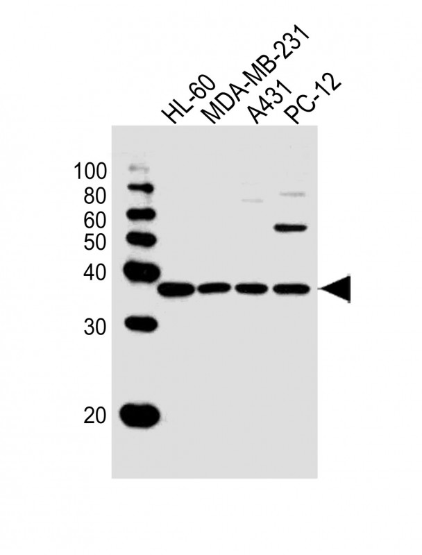 All lanes : Anti-STX4 Antibody (Center) at 1:1000 dilution Lane 1: HL-60 whole cell lysate Lane 2: MDA-MB-231 whole cell lysate Lane 3: A431 whole cell lysate Lane 4: PC-12 whole cell lysate Lysates/proteins at 20 μg per lane. Secondary Goat Anti-Rabbit IgG, (H+L), Peroxidase conjugated at 1/10000 dilution. Predicted band size : 34 kDa Blocking/Dilution buffer: 5% NFDM/TBST. |
