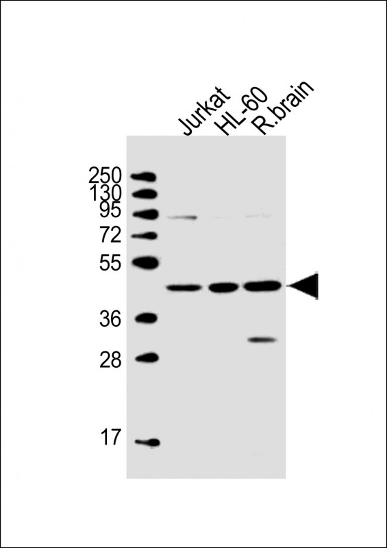 All lanes : Anti-GPR88 Antibody (C-term) at 1:2000 dilution Lane 1: Jurkat whole cell lysate Lane 2: HL-60 whole cell lysate Lane 3: rat brain lysate Lysates/proteins at 20 μg per lane. Secondary Goat Anti-Rabbit IgG, (H+L), Peroxidase conjugated at 1/10000 dilution. Predicted band size : 40 kDa Blocking/Dilution buffer: 5% NFDM/TBST. |