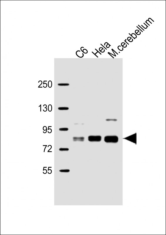 All lanes : Anti-Rps6ka1 Antibody (C-term) at 1:8000 dilution Lane 1: C6 whole cell lysate Lane 2: Hela whole cell lysate Lane 3: mouse cerebellum lysate Lysates/proteins at 20 μg per lane. Secondary Goat Anti-Rabbit IgG, (H+L), Peroxidase conjugated at 1/10000 dilution. Predicted band size : 82 kDa Blocking/Dilution buffer: 5% NFDM/TBST. |