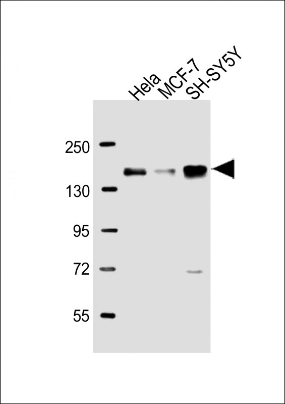 All lanes : Anti-MAML2 Antibody (Center) at 1:2000 dilution Lane 1: Hela whole cell lysate Lane 2: MCF-7 whole cell lysate Lane 3: SH-SY5Y whole cell lysate Lysates/proteins at 20 μg per lane. Secondary Goat Anti-Rabbit IgG, (H+L), Peroxidase conjugated at 1/10000 dilution. Predicted band size : 125 kDa Blocking/Dilution buffer: 5% NFDM/TBST. |