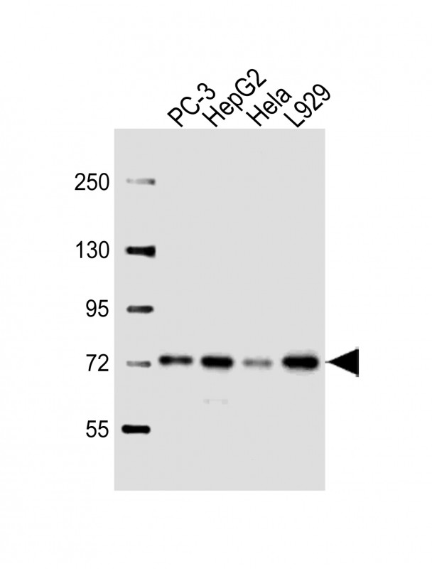 All lanes : Anti-HSPA9 Antibody (Center) at 1:2000 dilution Lane 1: PC-3 whole cell lysate Lane 2: HepG2 whole cell lysate Lane 3: Hela whole cell lysate Lane 4: L929 whole cell lysate Lysates/proteins at 20 μg per lane. Secondary Goat Anti-Rabbit IgG, (H+L), Peroxidase conjugated at 1/10000 dilution. Predicted band size : 74 kDa Blocking/Dilution buffer: 5% NFDM/TBST. |