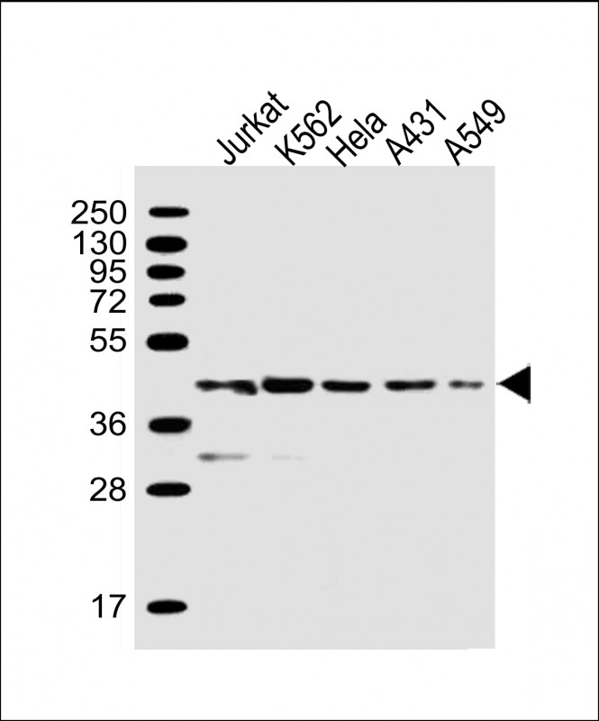 All lanes : Anti-DFFA Antibody (C-term) at 1:2000 dilution Lane 1: Jurkat whole cell lysate Lane 2: K562 whole cell lysate Lane 3: Hela whole cell lysate Lane 4: A431 whole cell lysate Lane 5: A549 whole cell lysate Lysates/proteins at 20 μg per lane. Secondary Goat Anti-Rabbit IgG, (H+L), Peroxidase conjugated at 1/10000 dilution. Predicted band size : 37 kDa Blocking/Dilution buffer: 5% NFDM/TBST. |