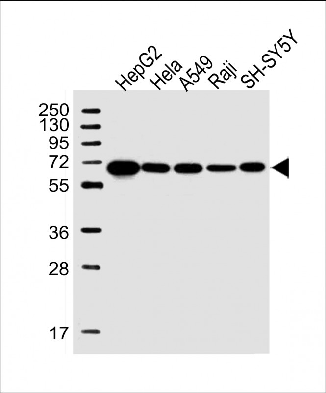 All lanes : Anti-IGF2BP2 Antibody (C-term) at 1:2000 dilution Lane 1: HepG2 whole cell lysate Lane 2: Hela whole cell lysate Lane 3: A549 whole cell lysate Lane 4: Raji whole cell lysate Lane 5: SH-SY5Y whole cell lysate Lysates/proteins at 20 μg per lane. Secondary Goat Anti-Rabbit IgG, (H+L), Peroxidase conjugated at 1/10000 dilution. Predicted band size : 66 kDa Blocking/Dilution buffer: 5% NFDM/TBST.
