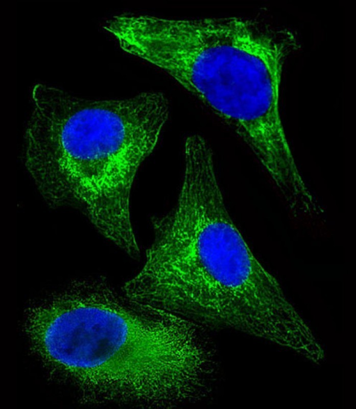 Immunofluorescent analysis of 4% paraformaldehyde-fixed, 0. 1% Triton X-100 permeabilized HeLa (human cervical epithelial adenocarcinoma cell line) cells labeling Pdx1 with APR15650G at 1/25 dilution, followed by Dylight? 488-conjugated goat anti-rabbit IgG (NK179883) secondary antibody at 1/200 dilution (green). Immunofluorescence image showing cytoskeleton staining on HeLa cell line. The nuclear counter stain is DAPI (blue).