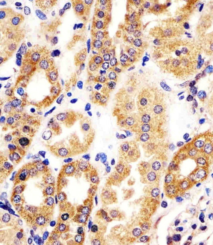 APR12407G staining HTR1E in human kidney tissue sections by Immunohistochemistry (IHC-P - paraformaldehyde-fixed, paraffin-embedded sections). Tissue was fixed with formaldehyde and blocked with 3% BSA for 0. 5 hour at room temperature; antigen retrieval was by heat mediation with a citrate buffer (pH6). Samples were incubated with primary antibody (1/25) for 1 hours at 37°C. A undiluted biotinylated goat polyvalent antibody was used as the secondary antibody.