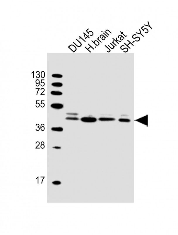 All lanes : Anti-HTR1E Antibody (C-Term) at 1:2000 dilution Lane 1: DU145 whole cell lysate Lane 2: human brain lysate Lane 3: Jurkat whole cell lysate Lane 4: SH-SY5Y whole cell lysate Lysates/proteins at 20 μg per lane. Secondary Goat Anti-Rabbit IgG, (H+L), Peroxidase conjugated at 1/10000 dilution. Predicted band size : 42 kDa Blocking/Dilution buffer: 5% NFDM/TBST. |