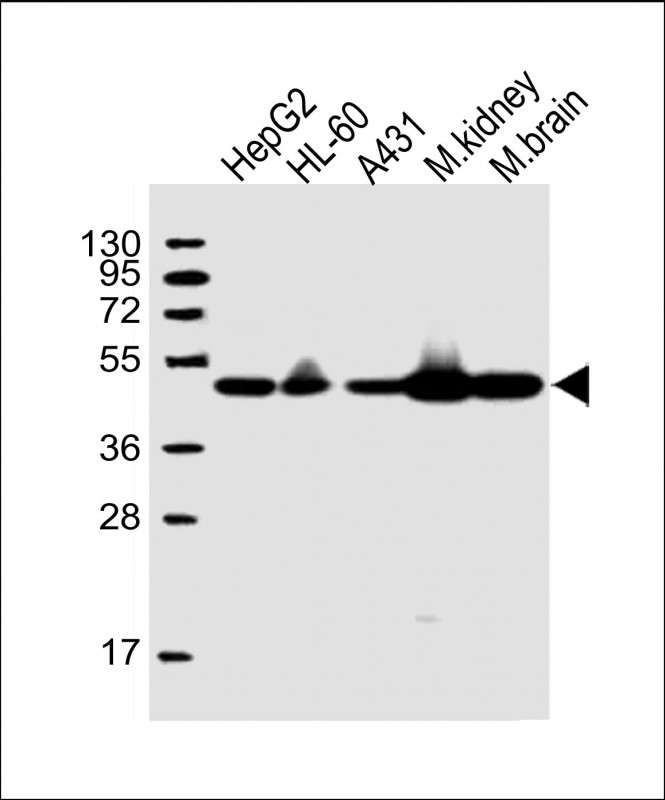 All lanes : Anti-NDUFV1 Antibody (Center) at 1:2000 dilution Lane 1: HepG2 whole cell lysate Lane 2: HL-60 whole cell lysate Lane 3: A431 whole cell lysate Lane 4: mouse kidney lysate Lane 5: mouse brain lysate Lysates/proteins at 20 μg per lane. Secondary Goat Anti-Rabbit IgG, (H+L), Peroxidase conjugated at 1/10000 dilution. Predicted band size : 51 kDa Blocking/Dilution buffer: 5% NFDM/TBST. |
