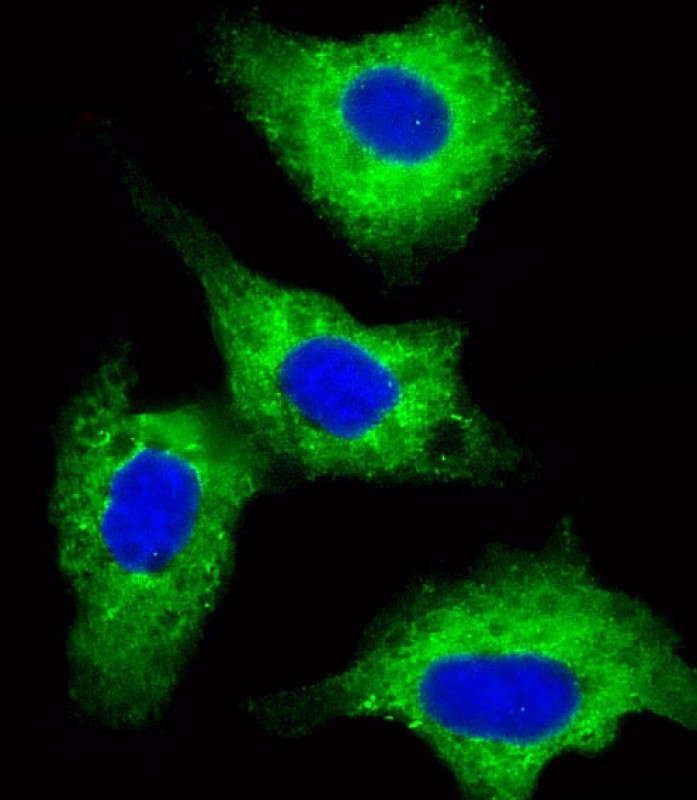 Immunofluorescent analysis of 4% paraformaldehyde-fixed, 0. 1% Triton X-100 permeabilized HepG2 (human liver hepatocellular carcinoma cell line) cells labeling Pdx1 with AP12326C at 1/25 dilution, followed by Dylight? 488-conjugated goat anti-rabbit IgG (NK179883) secondary antibody at 1/200 dilution (green). Immunofluorescence image showing cytoplasm staining on HepG2 cell line. The nuclear counter stain is DAPI (blue).