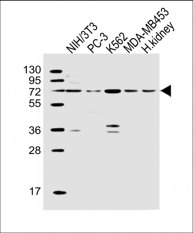 All lanes : Anti-DVL1 Antibody (Center) at 1:2000 dilution Lane 1: NIH/3T3 whole cell lysate Lane 2: PC-3 whole cell lysate Lane 3: K562 whole cell lysate Lane 4: MDA-MB453 whole cell lysate Lane 5: human kidney lysate Lysates/proteins at 20 μg per lane. Secondary Goat Anti-Rabbit IgG, (H+L), Peroxidase conjugated at 1/10000 dilution. Predicted band size : 75 kDa Blocking/Dilution buffer: 5% NFDM/TBST. |