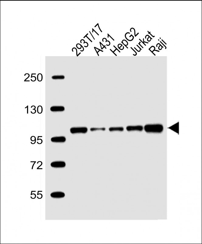 All lanes : Anti-SLC22A2 Antibody (N-term) at1:2000 dilution Lane 1: 293T/17 whole cell lysate Lane 2: A431 whole cell lysate Lane 3: HepG2 whole cell lysate Lane 4: Jurkat whole cell lysate Lane 5: Raji whole cell lysate Lysates/proteins at 20 μg per lane. Secondary Goat Anti-Rabbit IgG, (H+L), Peroxidase conjugated at 1/10000 dilution. Predicted band size : 63 kDa Blocking/Dilution buffer: 5% NFDM/TBST.