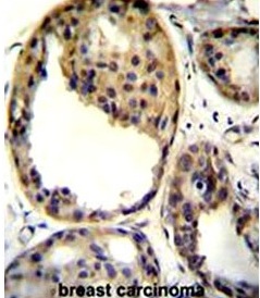 Formalin-fixed and paraffin-embedded human breast carcinoma tissue reacted with AKT1 antibody, which was peroxidase-conjugated to the secondary antibody, followed by DAB staining.