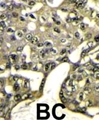 Formalin-fixed and paraffin-embedded human breast carcinoma tissue reacted with AKT1 antibody, which was peroxidase-conjugated to the secondary antibody, followed by DAB staining.