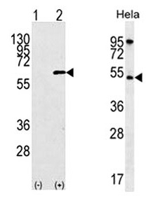 AKT1 Antibody western blot analysis in 293 cell lysates (2 μg/lane) either nontransfected (Lane 1) or transiently transfected with the AKT1 gene (Lane 2) and HeLa cell lysate (35 μg/lane). |