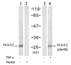 Western blot analysis of extract from NIH/3T3 cells, untreated or treated with TNF-a (20ng/ml, 5min), using 14-3-3 Zeta (Delta) Antibody (S58) ( lane 1 and 2) and Phospho-14-3-3 Zeta (Delta)-S58 Antibody (APR12852G, lane 3 and 4).