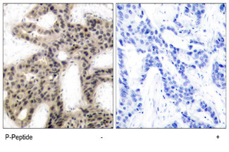 Immunohistochemical analysis of paraffin-embedded human breast carcinoma tissue using Phospho-4E-BP1-T45 Antibody ( APR09120G). |