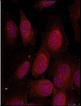 Immunofluorescence staining of methanol-fixed HeLa cells using GATA1 Antibody (S142) ( APR16077G,Red). |