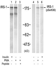 Western blot analysis of extracts from 293 cells treated with insulin(100nM, 30min) or PMA (0.2?M, 15min) using IRS-1 Antibody (S636) ( APR08034G, Lane 1, 2 and 3) and Phospho-IRS-1-S636 Antibody ( AE1018c, Lane 4, 5 and 6).
