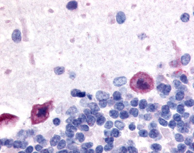Anti-Adenosine A1 Receptor antibody APG03133G IHC of rat brain, Purkinje neurons. |