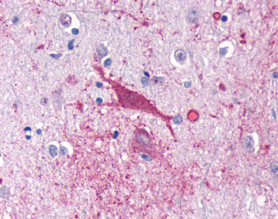 Anti-CNR1 / CB1 antibody APG02681G IHC of human brain, neuron. |