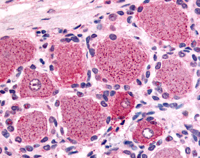 Anti-5HT1D Receptor antibody AMM06008G IHC of human spinal cord, dorsal root ganglion. |