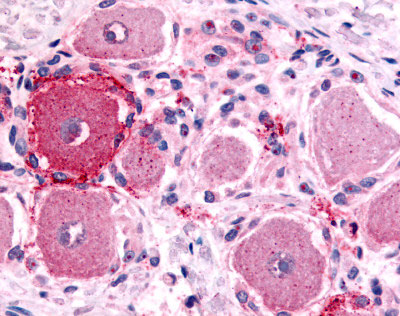 Anti-5HT1D Receptor antibody AMM06009G IHC of human spinal cord, dorsal root ganglion. |
