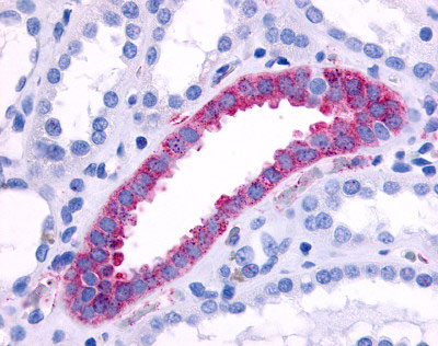 Anti-ADRA1B antibody AMM05577G IHC of human kidney, collecting duct. |