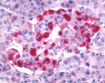 Anti-GRPR antibody AMM05995G IHC of human pancreas, islet of Langerhans. |